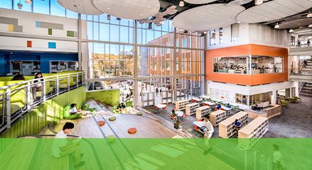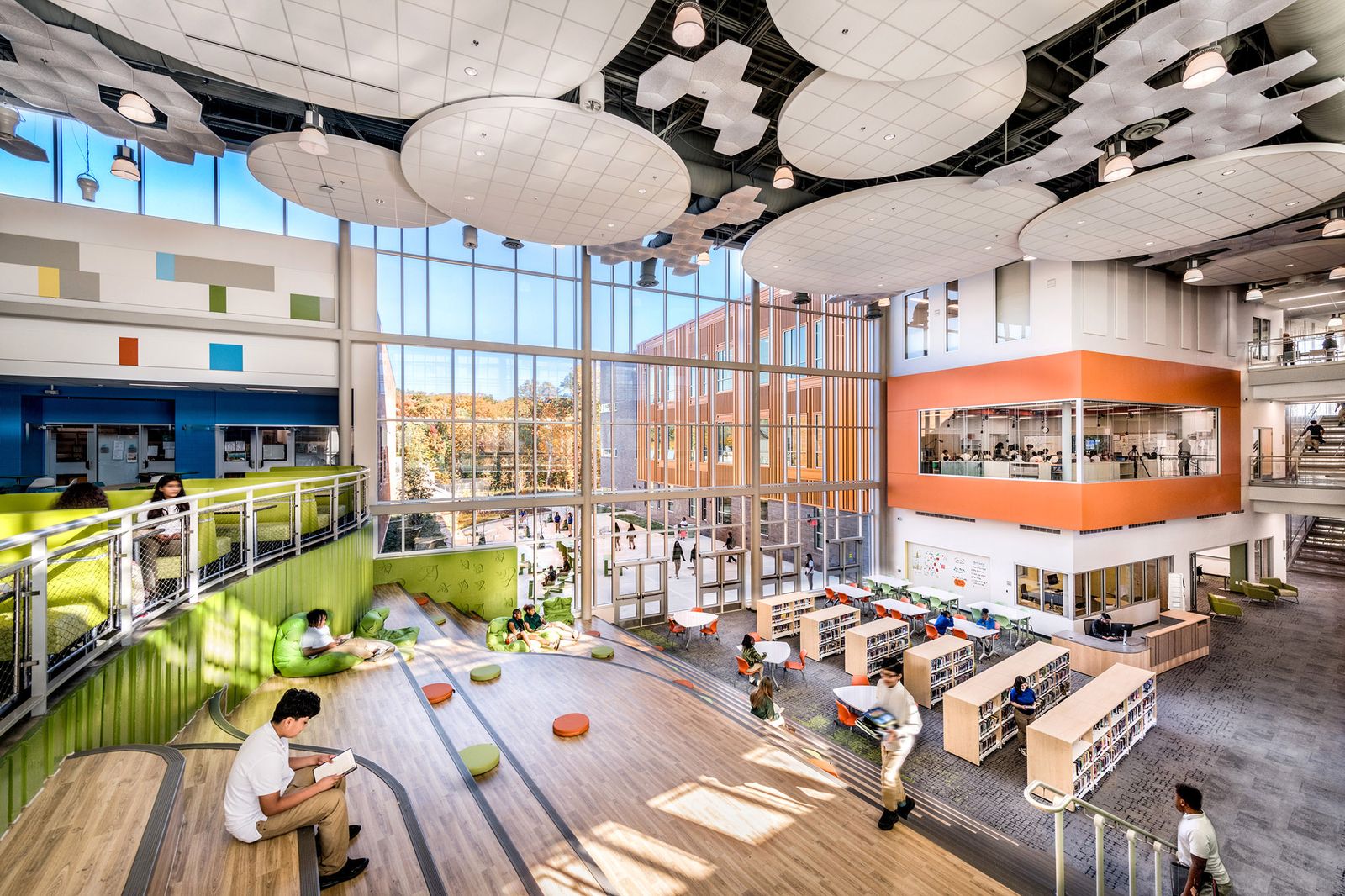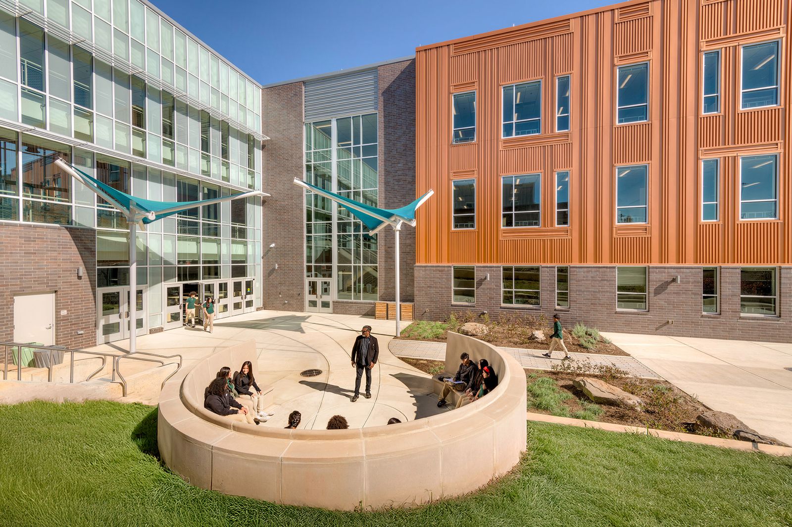 Abundant transparency and transitional spaces between interior program and the natural park setting were achieved through use of large curtain walls at community commons and courtyards, as well as between school and park spaces.