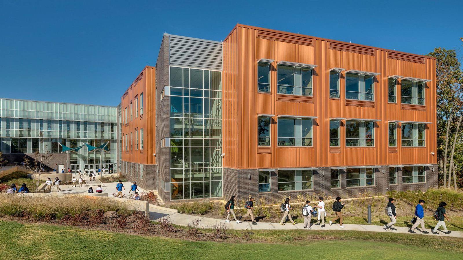 Building on a 40-year partnership with Prince George’s County Public Schools, the new Ellen Ochoa Middle School involved the development of a 1,200-student school sited in the Glenridge Community Park in Woodlawn, Maryland. It was immediately apparent that many stakeholders would need to be engaged to ensure both that the school met the needs of students, families, staff, and neighbors, and that the school and park were fully integrated with each other and the surrounding community. The siting of the building and its configuration became critical components in ensuring that the school lives in harmony with the park which it inhabits.